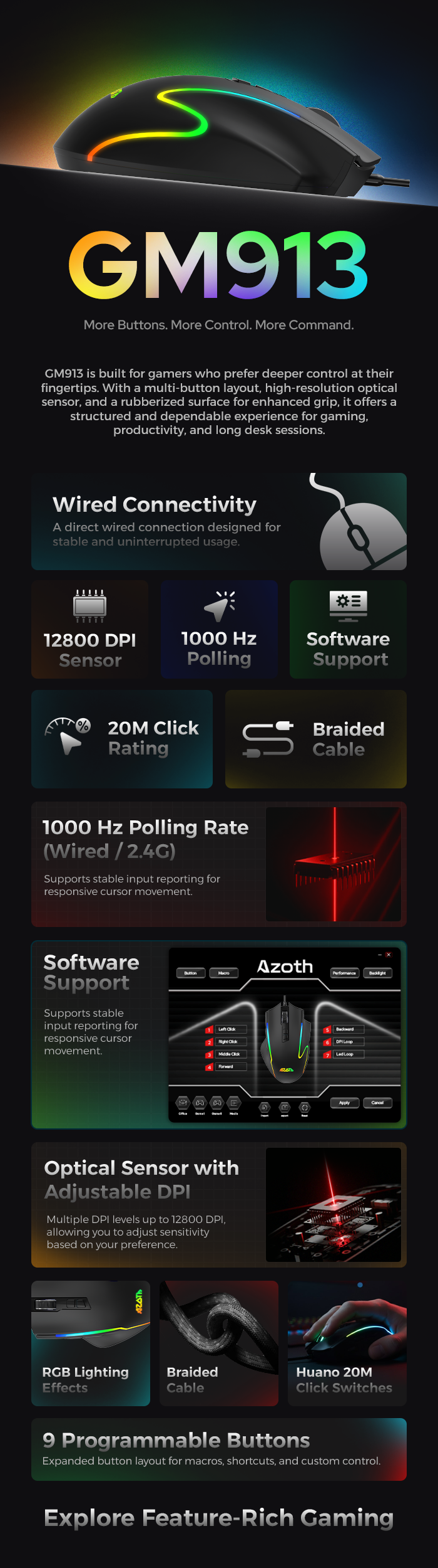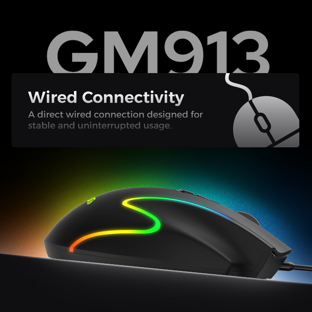9-Button Wired Precision Gaming Mouse Perfect for gamers who depend on multiple bindings and macro control. GM913 makes complex gameplay easier with nine programmable buttons and a high-grade sensor.